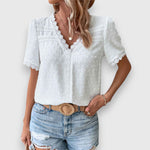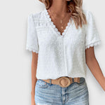 Halenka Wassa s krajkou spojuje jemnou krajku s moderním střihem a dodává tvému outfitu elegantní lehkost. Díky krátkým rukávům a jemné struktuře je ideální pro teplé dny s nádechem stylu.