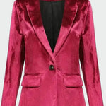 Impozantní sako s sametovou texturou, které dodává luxus a eleganci každému vzhledu. Jeho klasický límec v kombinaci s jedním knoflíkem vpředu vytváří rovnováhu mezi nadčasovým a moderním stylem. Ideální pro večerní výlety nebo zvláštní příležitosti.