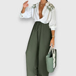 Sada Nivana kombinuje elegantní halenku s jemným květinovým vzorem a splývavé kalhoty se širokými nohavicemi – ideální pro stylové dny. Lehký materiál a vysoký límec dodávají outfitu ženský a sofistikovaný nádech.